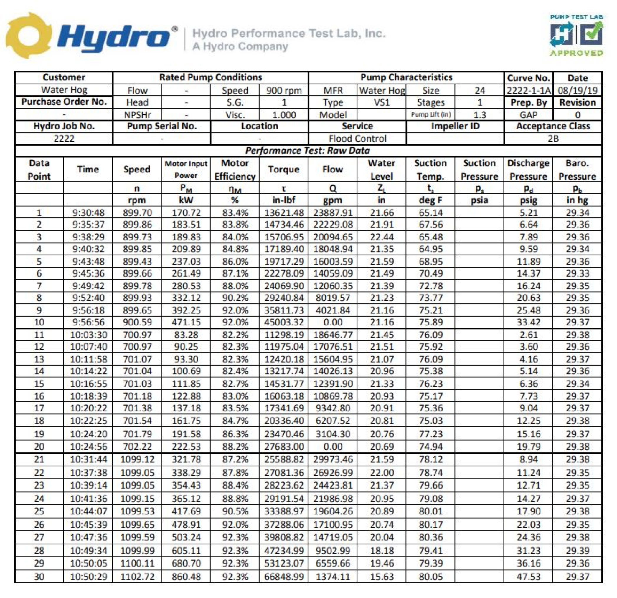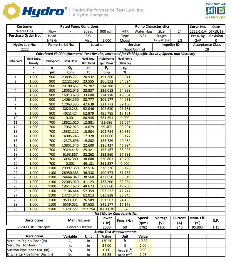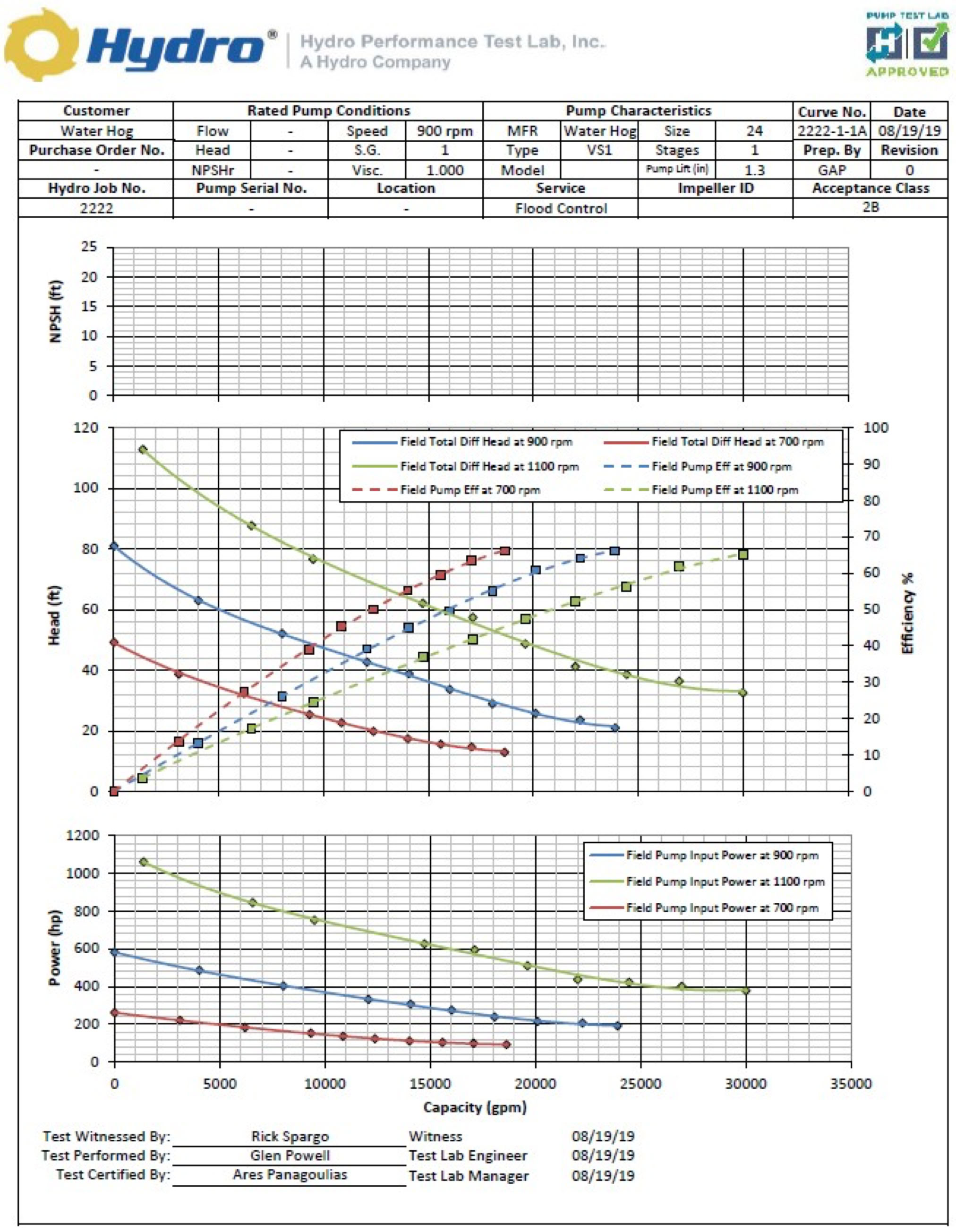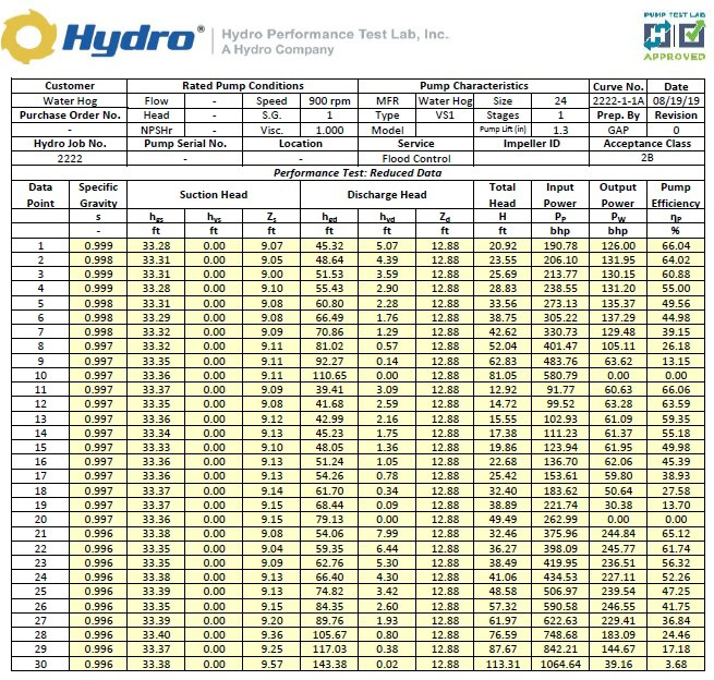 As you will see attached, I included an appendix that expands out the data from your test curve 2222-1-1A, which gives you an idea of the NPSH available during the test. This NPSH available is essentially the suction pressure due to the atmospheric pressure (about 33 ft) and the submergence level of the pump (about 9 ft, Suction Head Zs in the original report). The resulting NPSH available during the test is about 41.5 ft throughout the testing. At no time during the testing of the pump was cavitation observed. So, at the very least this 41.5ft is an upper bound for the NPSH required. In other words, we know from the testing that the value of NPSHr will be below 41.5 ft at all speeds and flow rates we tested. This is a kind of benchmark value.